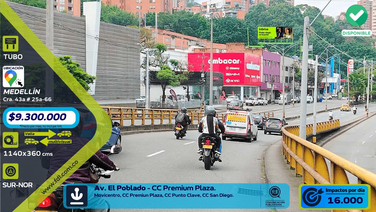 - El precio de Valla Gran Formato Av. El Poblado · Movicentro CC Premium Plaza – Medellín comienza desde $ 9.300.000 mensual. Para obtener una cotización personalizada con fechas específicas, puedes solicitarla directamente desde esta página.