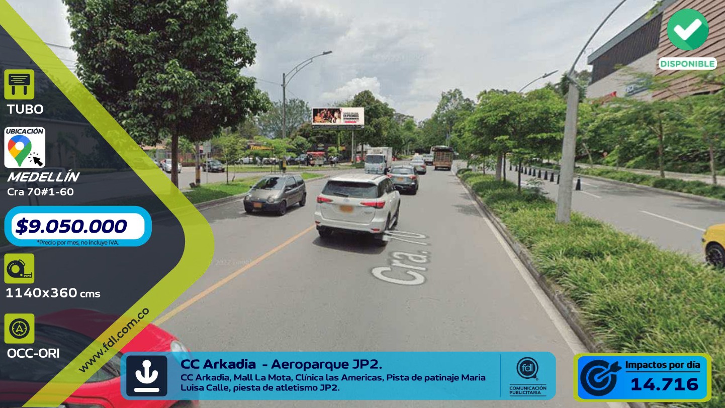 - El precio de Valla Gran Formato Av. 70 · CC Arkadia Aeroparque Juan Pablo II – Medellín comienza desde $ 9.050.000 mensual. Para obtener una cotización personalizada con fechas específicas, puedes solicitarla directamente desde esta página.