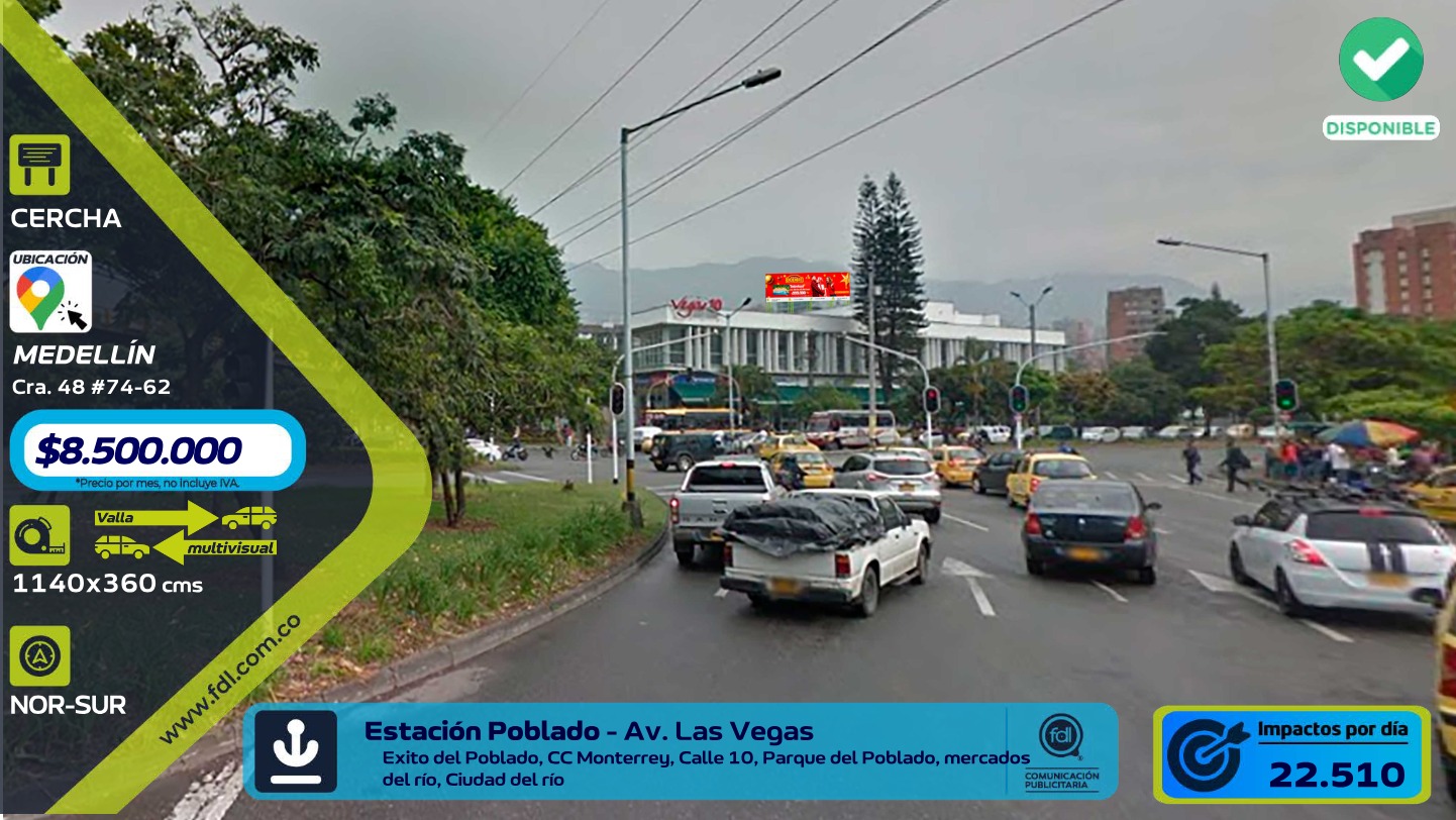 - El precio de Cercha Iluminada Av. Las Vegas · Estación Metro El Poblado – Medellín comienza desde $ 8.500.000 mensual. Para obtener una cotización personalizada con fechas específicas, puedes solicitarla directamente desde esta página.