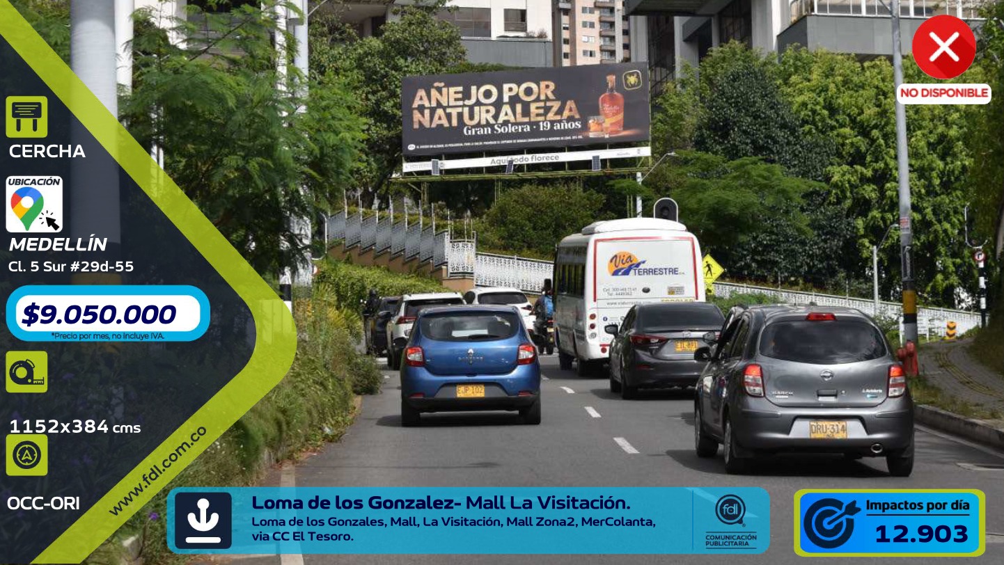 - El precio de Valla Gran Formato Cl. 5 Sur · Vía Av. El Poblado Parque la Presidenta – Medellín comienza desde $ 9.050.000 mensual. Para obtener una cotización personalizada con fechas específicas, puedes solicitarla directamente desde esta página.