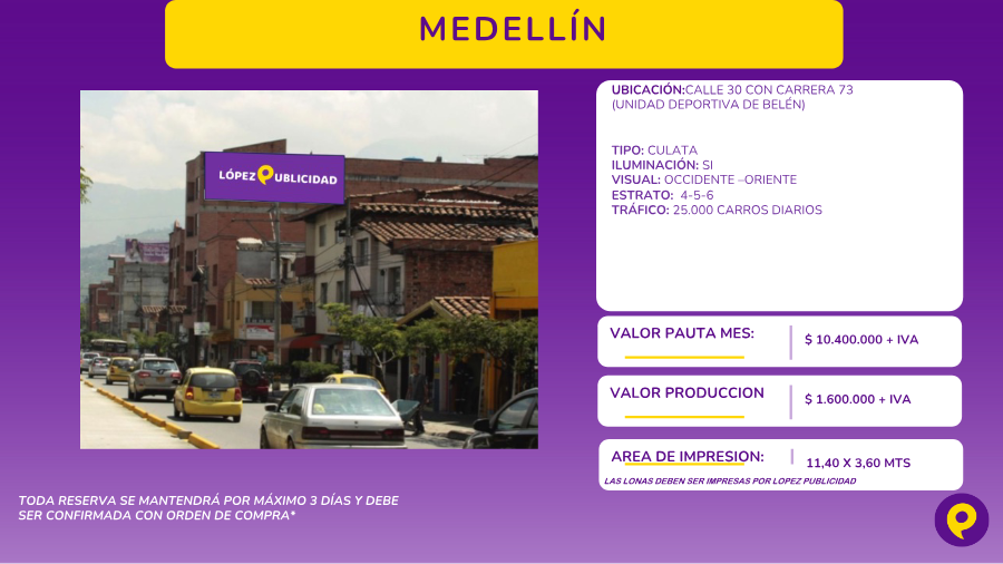 - Culata ubicada en Medellín sobre la Calle 30 con Carrera 73, frente a la Unidad Deportiva de Belén. Esta estructura publicitaria iluminada tiene una alta exposición vehicular con un tráfico diario de 25,000 carros. Sus dimensiones son 11,40 x 3,60 metros, ofreciendo visibilidad desde el occidente hacia el oriente. Ideal para impactar al tráfico vehicular de las estratos 4, 5 y 6.