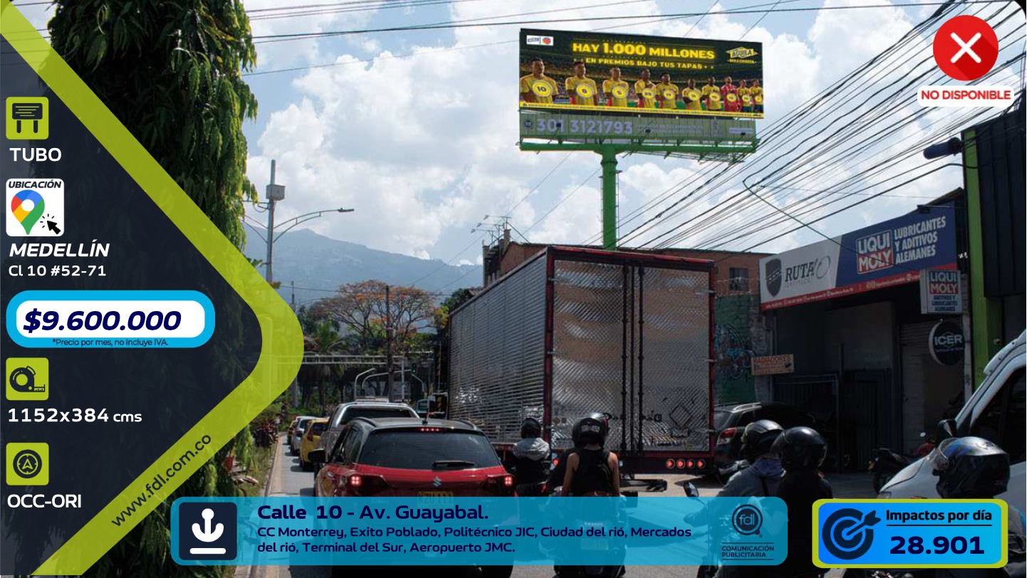- El precio de Valla Gran Formato Av. Guayabal · CC Monterrey Terminal del Sur – Medellín comienza desde $ 9.600.000 mensual. Para obtener una cotización personalizada con fechas específicas, puedes solicitarla directamente desde esta página.