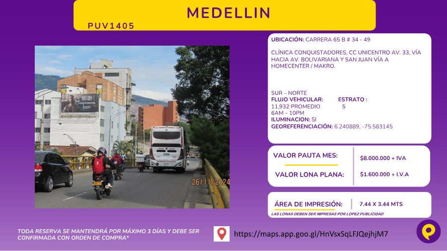 - Billboard visible en la Carrera 65 B en Medellín, en proximidad a la Clínica Conquistadores y el CC Unicentro. Tiene una medida de 7.44 x 3.44 mts y está equipada con iluminación para una mejor visibilidad nocturna. Esta ubicación estratégica cuenta con un tráfico vehicular promedio de 11,932 vehículos entre las 6 AM y 10 PM, siendo ideal para campañas dirigidas a un público vehicular.