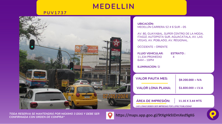 - Valla unipolar iluminada ubicada en un punto estratégico de Medellín, sobre el Super Centro de la Moda. Con alta visibilidad vehicular, el espacio ofrece publicidad eficaz cerca de vías principales como Av. Guayabal y Autopista Sur. Las dimensiones son de 11.16 m x 3.44 m, ideal para grandes formatos.