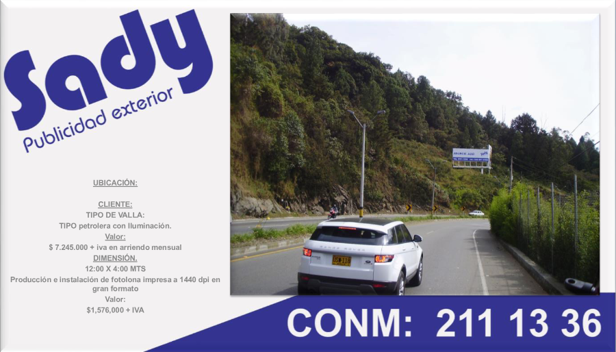 - El precio de Sady Publicidad exterior comienza desde $ 7.245.000 mensual. Para obtener una cotización personalizada con fechas específicas, puedes solicitarla directamente desde esta página.
