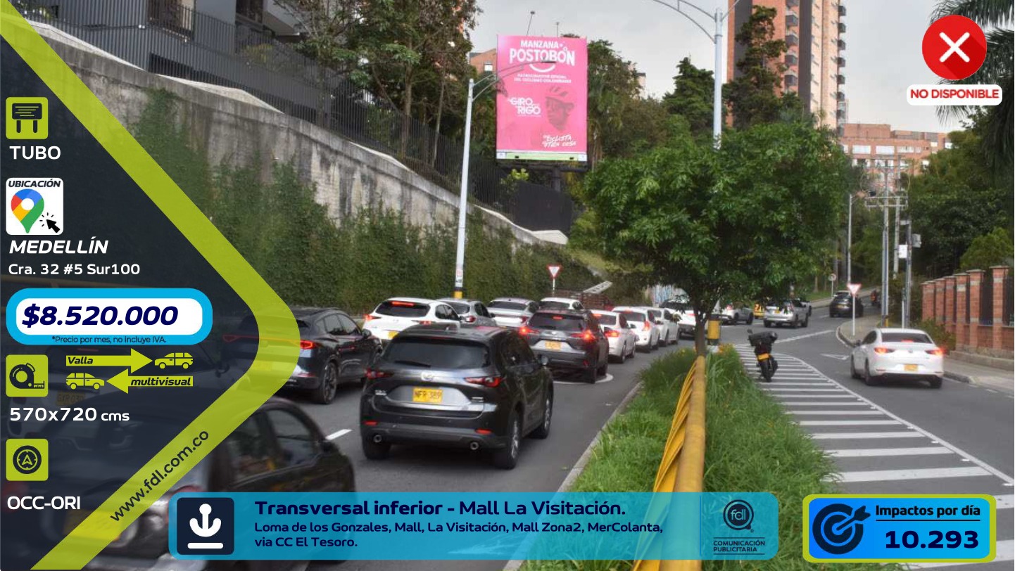 - El precio de Valla Iluminada Transversal Inferior · Mall La Visitación CC El Tesoro – Medellín comienza desde $ 8.520.000 mensual. Para obtener una cotización personalizada con fechas específicas, puedes solicitarla directamente desde esta página.