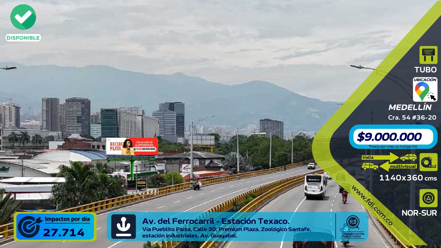 - El precio de Valla Tubo Av. Ferrocarril · Plaza Mayor Exposiciones Norte–Sur – Medellín comienza desde $ 9.000.000 mensual. Para obtener una cotización personalizada con fechas específicas, puedes solicitarla directamente desde esta página.