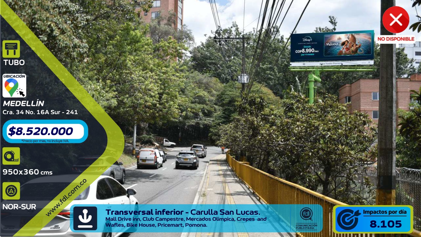 - Valla publicitaria ubicada en Transversal inferior con dirección a Carulla San Lucas, visible desde lugares como Mall Drive inn y Club Campestre.