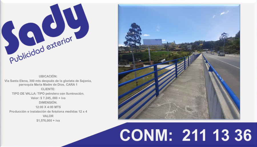 - Valla tipo petrolera con iluminación ubicada en Vía Santa Elena, después de la glorieta de Sajonia. Esta estructura de 12x4 metros es ideal para campañas dirigidas a tráfico vehicular. La instalación es en una zona con buena visibilidad y exposición a vehículos.