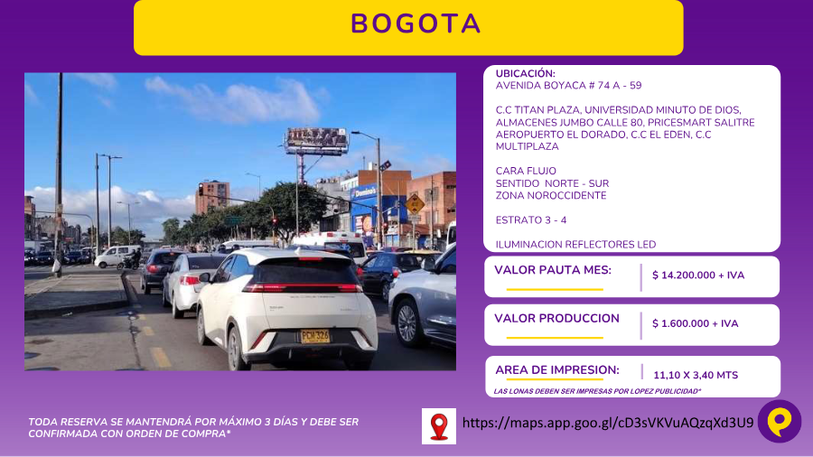 - Valla publicitaria iluminada ubicada en la Avenida Boyacá de Bogotá, en la zona noroccidental. La estructura está equipada con reflectores LED, lo que garantiza su visibilidad durante la noche. Tiene un área de impresión de 11,10 x 3,40 metros, ideal para alcanzar un alto flujo vehicular en sentido norte-sur.
